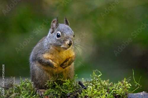Fototapeta premium Douglas Squirrel standing on back paws on a moss-covered log.