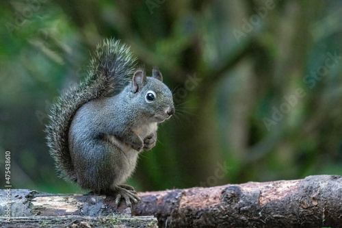 Naklejka premium Douglas Squirrel standing on back paws on a moss-covered log.