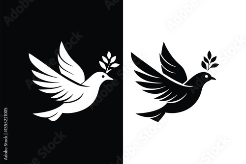 Obraz premium Dove Flying with Olive Branch Logo Icon Black & White Split Peace Symbol Design