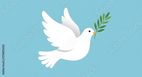 © Baks, Obraz premium Dove of Peace: Stylized White Bird with Olive Branch on Light Blue Background