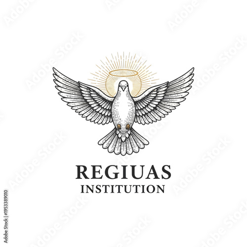 Obraz premium Dove with Halo and Light Rays Above Regiuas Institution Logo