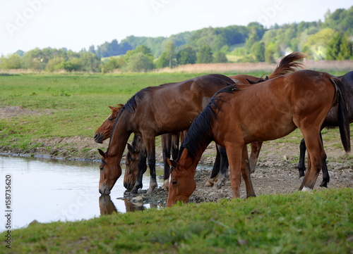 © Grubärin, Fototapeta premium down at the river, few wild horses drinking at the river