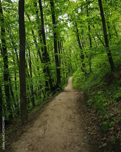 © andrbk, Fototapeta premium Downhill path in green spring forest. Straight footpath in dark woods.