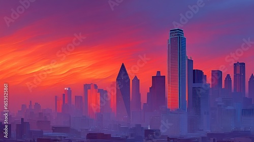 Fototapeta premium Downtown cityscape silhouetted against a vibrant red and purple sunset sky
