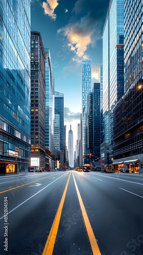 © Spectrum, Fototapeta premium Downtown cityscape with road and tall buildings in the background