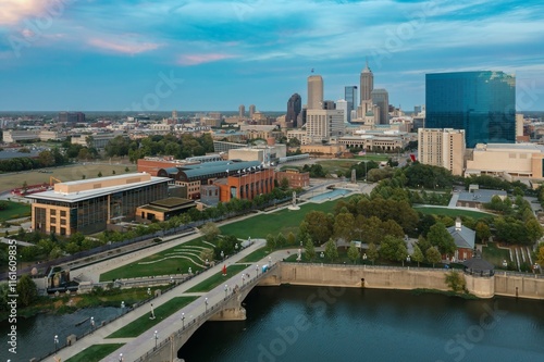 © Zenstratus, Obraz premium Downtown Indianapolis skyline at twilight, featuring the White River State Park. Public spaces and city buildings. White River, Indianapolis, Indiana, United States