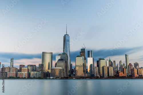 Obraz premium Downtown New York skyline stands tall as sun sets in the east.