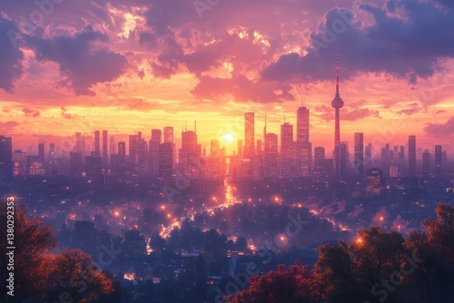 © Aleksandra, Fototapeta premium Downtown Omaha Nebraska Cityscape at Sunset with Glowing Skyline and Modern Skyscrapers