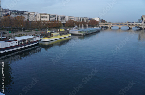 © poupine, Fototapeta premium downtown paris france from seine river with old wooden barges early morning and stone bridge with subway train