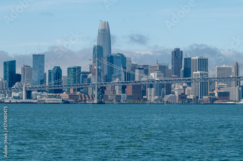 Obraz premium Downtown San Francisco and Oakland Bay Bridge on sunny day