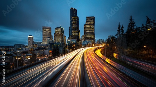 © WS Studio 1985, Fototapeta premium Downtown Seattle Skyscrapers with Freeway Lights at Dusk