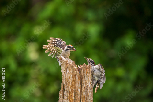 © jamie, Fototapeta premium Downy Woodpecker mates fighting