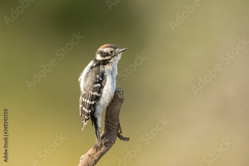 Fototapeta premium Downy woodpecker on top of branch.