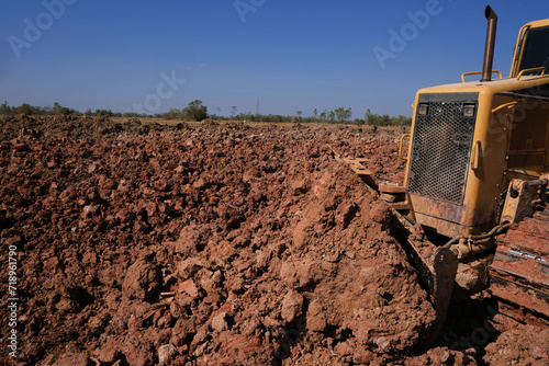 © Noppalit, Obraz premium Dozer is pushing dirt. Bulldozer is working gravel surface for new road.