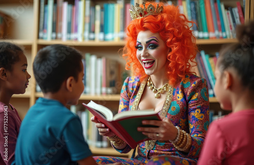 © Pete, Obraz premium Drag queen in vibrant costume reads story to attentive children. Performer with bright orange hair, makeup entertains kids in library. Joyful event promotes literacy, inclusion, diversity,