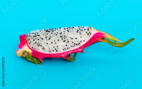 © schankz, Fototapeta premium Dragon fruit in a section isolated on a blue background