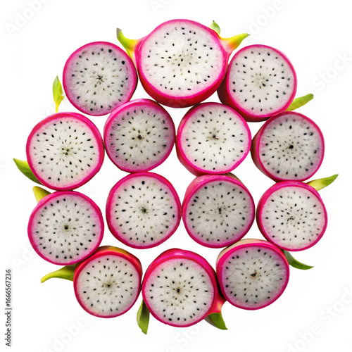 Fototapeta premium Dragon fruit slices arranged isolated on transparent background