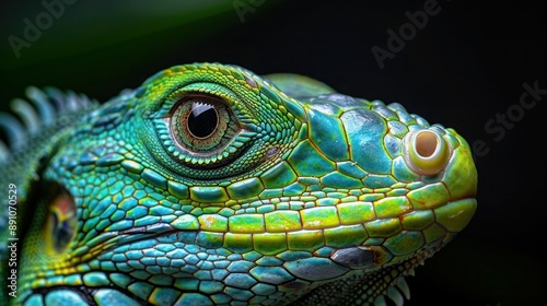 © Tuong, Fototapeta premium Dragon-like Green Iguana Eye Closeup on Black Background