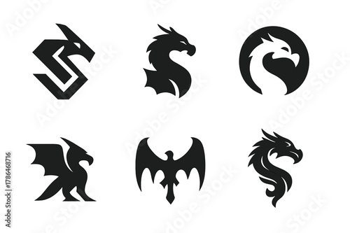 © Coosh448, Obraz premium Dragon Logo Collection. Dragons. Set Logo of Dragon Collection: Abstract geometric, Filled silhouette, Negative space, Flat solid, Symmetrical form, Stylized