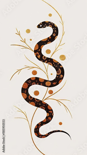 Fototapeta premium Dragon orSnake illustration design, minimalist, graphic design, clear scales, writhing body, gold foil paper brush marks