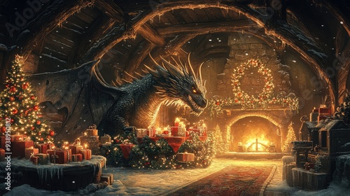 Obraz premium Dragon's Christmas Feast in a Cozy Stone Cottage