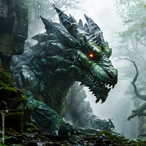 © bhashi, Fototapeta premium dragon shaped large fantasy animal in the dark forest