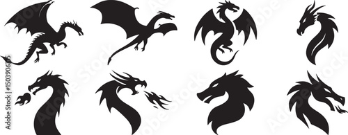 © Rukhsana, Naklejka premium Dragon Silhouette Vector Set – Mythical Fire-Breathing Creature Icons in Black