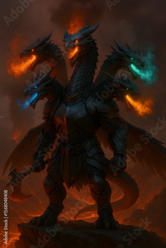 © Andefastudio, Fototapeta premium Dragon Warrior with Multiple Heads and Fiery Breath