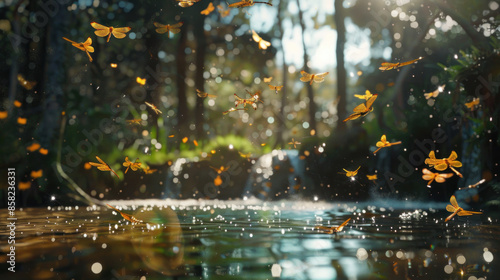 © NooPaew, Naklejka premium Dragonflies hovering over a forest stream