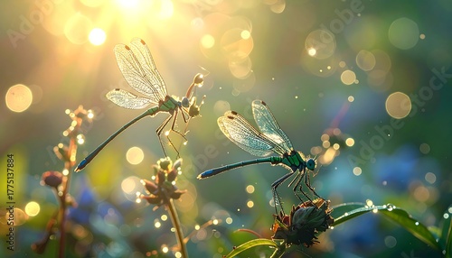 © desain, Fototapeta premium Dragonflies in the Morning Sun A Peaceful Scene in Nature's Embrace with Dew Drops and Bokeh