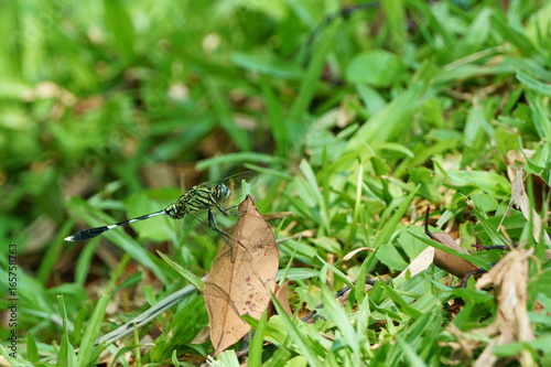 © Phu, Obraz premium Dragonfly clinging to a dried leaf
