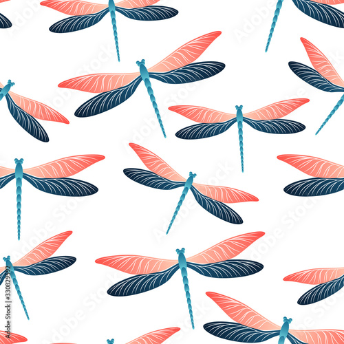 © SunwArt, Fototapeta premium Dragonfly funky seamless pattern. Spring clothes textile print with flying adder insects. Garden