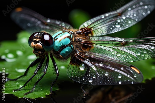 Fototapeta premium Dragonfly in close-up, dew in the wings, radiant nature., generative IA
