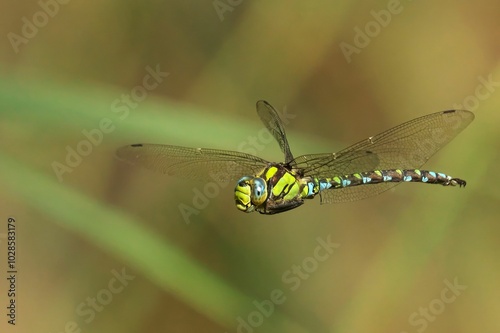 Fototapeta premium Dragonfly in Flight with Detailed Wings and Vibrant Colors