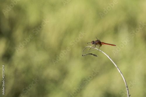 © supanee2550, Obraz premium Dragonfly on dry leaf. background blur