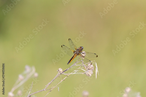 © Shchipkova Elena, Fototapeta premium Dragonfly sits on dry grass on a green background close up