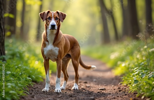 © Vadym, Naklejka premium Drahthaar dog on forest path. This hunting breed enjoys a spring walk. Loyal canine companion stands alert in nature. Sunlight filters through green trees.