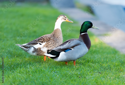 © Юлия Мальсагова, Fototapeta premium Drake and duck on the green grass