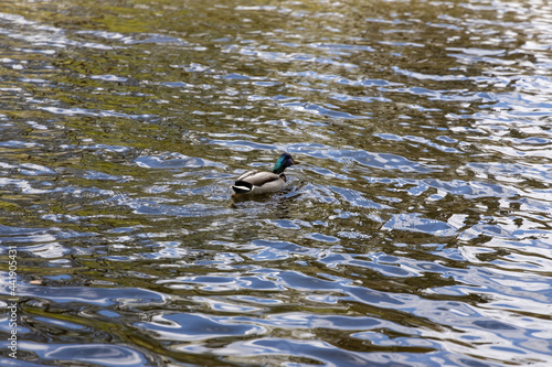 Fototapeta premium Drake duck swims on the lake. Summer day.