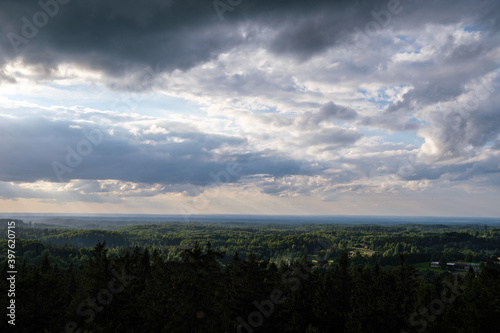 © Martins Vanags, Obraz premium dramatatic red dark sunset over the fields and cities