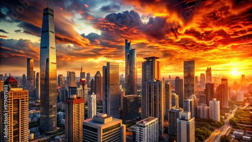 Obraz premium dramatic abstract fiery red orange sunset cityscape geometric shapes urban...