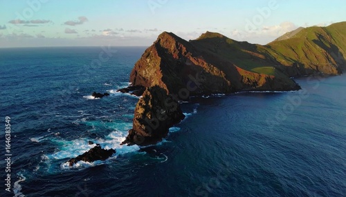 Naklejka premium Dramatic aerial view of a rugged volcanic island coastline, waves crashing...