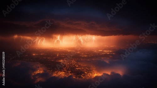 © Maksum Udod, Fototapeta premium Dramatic Aerial View of Lightning Over a City with Fiery Clouds and a Dark Sky