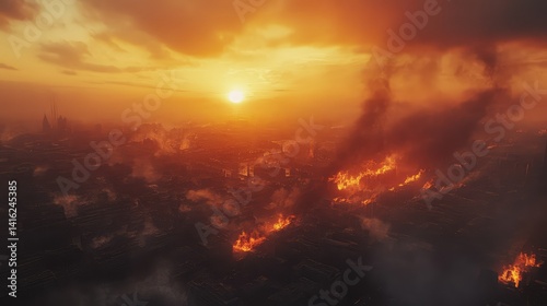 Naklejka premium Dramatic Aerial View of Urban Landscape Engulfed in Flames and Smoke During Fiery Sunset, Capturing the Intensity of a Catastrophic Event