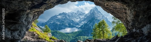 Fototapeta premium Dramatic Alpine Vista: Snow-Capped Peaks & Lush Valley Framed by a Dark Cave...