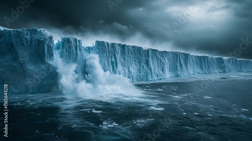 © horizon, Fototapeta premium Dramatic Antarctic glacier calving with massive ice chunks falling into the ocean, creating splashing waves under a stormy sky. Deep blue glacial ice contrasts with the pristine wilderness.