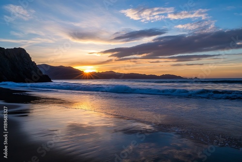 Naklejka premium Dramatic Beach Sunset with Waves and Beautiful Sky Reflections on Ocean...