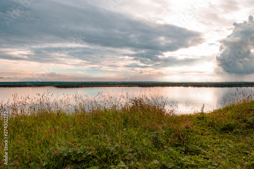 Obraz premium Dramatic beautiful pink blue orange sunset at river with reflection and clouds on natural background