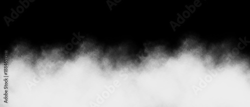 © Basit, Fototapeta premium Dramatic black and white low angle smoke cloud border effect for graphic design overlay featuring thick white mist rising against a solid dark background space