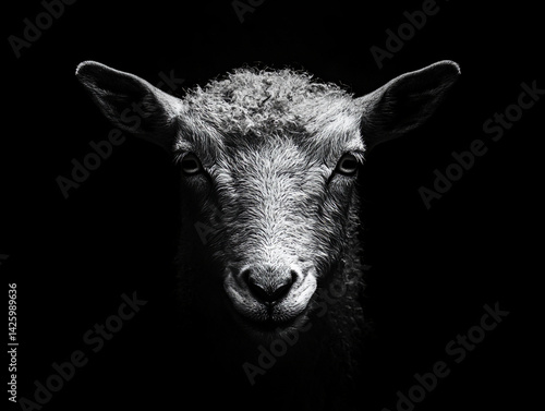 Fototapeta premium Dramatic Black and White Portrait of a Sheep Against a Dark Background